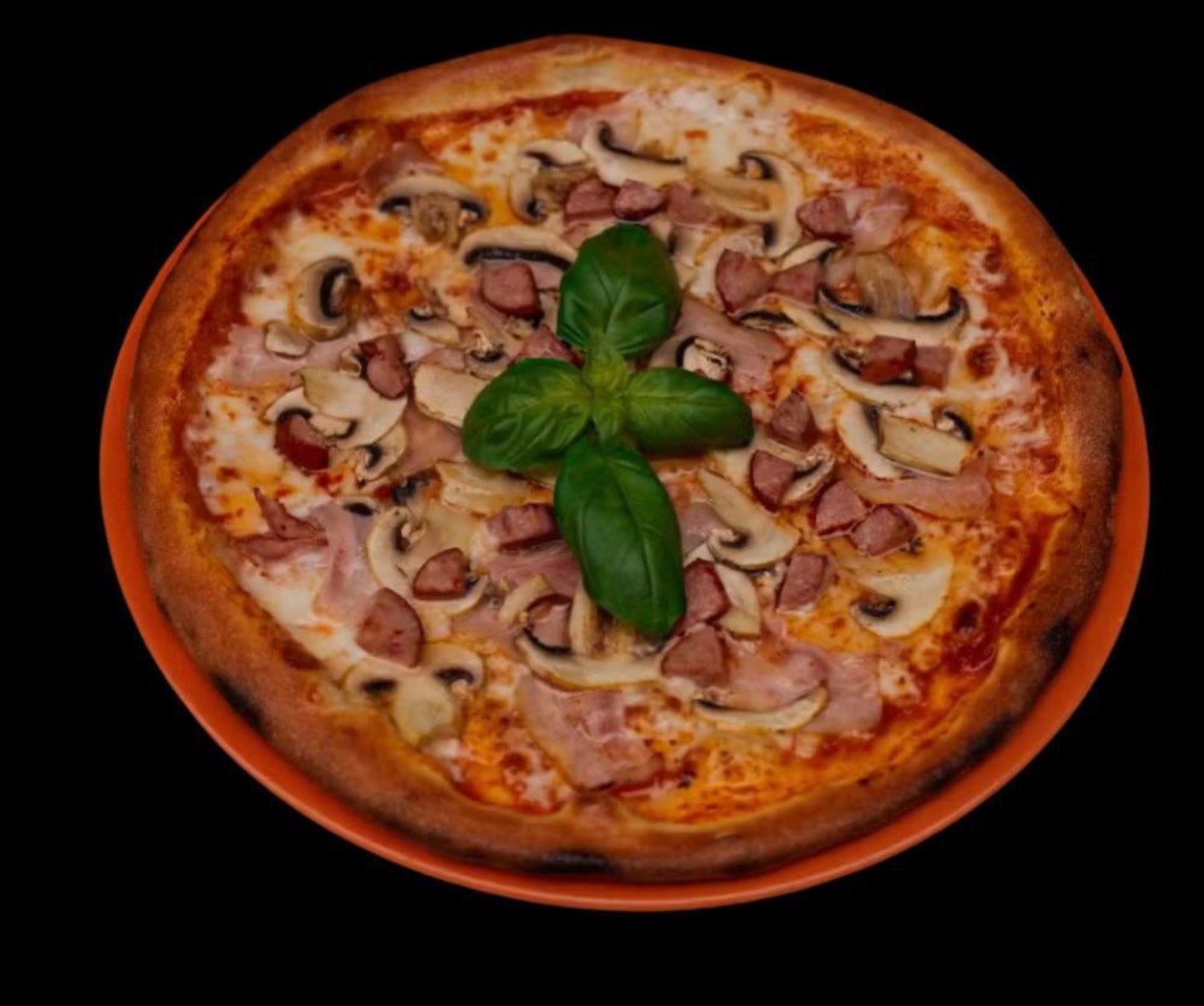 sos pomidorowy, mozzarella, szynka, pieczarki