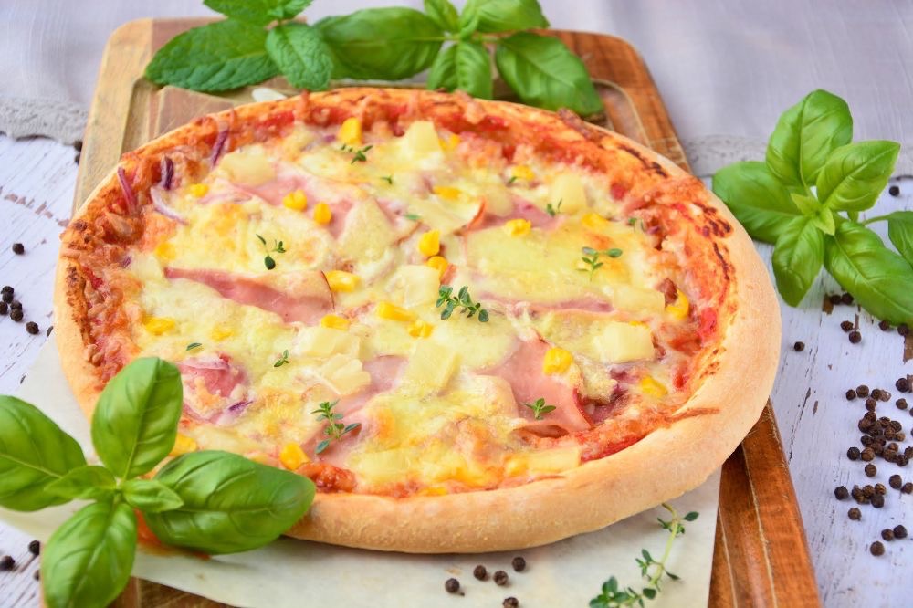 sos pomidorowy, mozzarella, szynka, ananas